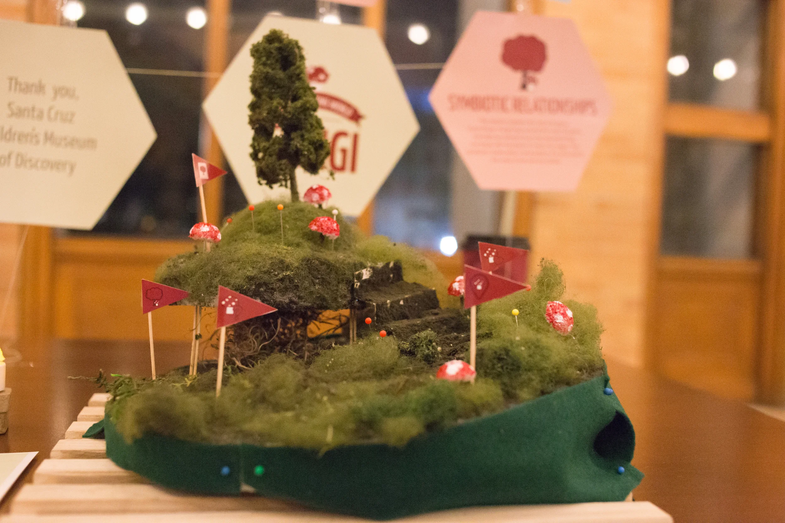 Once visitors reach the grass and tree of the second story, they learn about mushrooms - highlighting those specific to Santa Cruz, with hopes that they will recognize the local mushrooms in their surroundings outside of the exhibit once they leave. At the highest point in the exhibit is the Storytelling Tree, where children can gather round in a circle known as a "fairy ring" and listen to stories that are reminiscent of fungal folklore of the past.